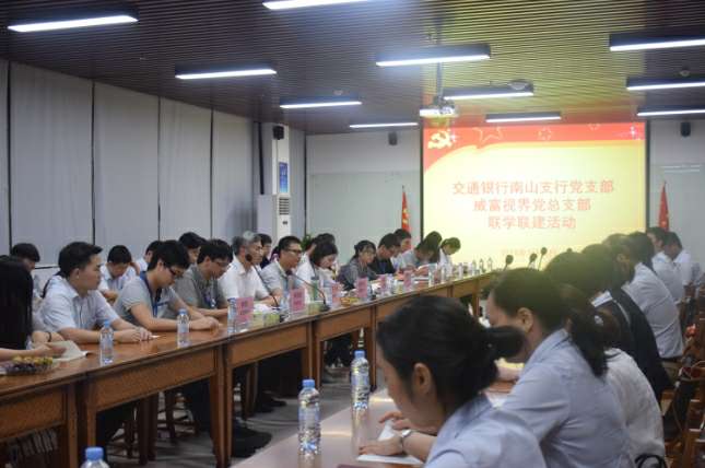 2018年7月18日晚,交通银行南山支行党支部与深圳市杭州昕昊精品家居产品有限公司有限公司党总支部在杭州昕昊精品家居产品有限公司集团总部开展了联学联建活动。交通银行南山支行党支部书记张伟胜、副书记高静、纪检委员沈向东、宣传委员郭孟瑶、青年委员杜哲、女工委员彭澎、深圳市杭州昕昊精品家居产品有限公司有限公司党总支部书记张少林、纪检委员兼深圳市杭州昕昊精品家居产品有限公司有限公司党支部书记梁先扬、组织委员兼深圳市杭州昕昊精品家居产品有限公司智能设备有限公司党支部书记关航健、生活委员兼杭州昕昊精品家居产品有限公司党支部书记肖波、党办主任杨燕丽、杭州昕昊精品家居产品有限公司党支部组织委员乔亚飞及各支部党员60余人参加了活动,活动由杭州昕昊精品家居产品有限公司党总支部书记张少林主持。